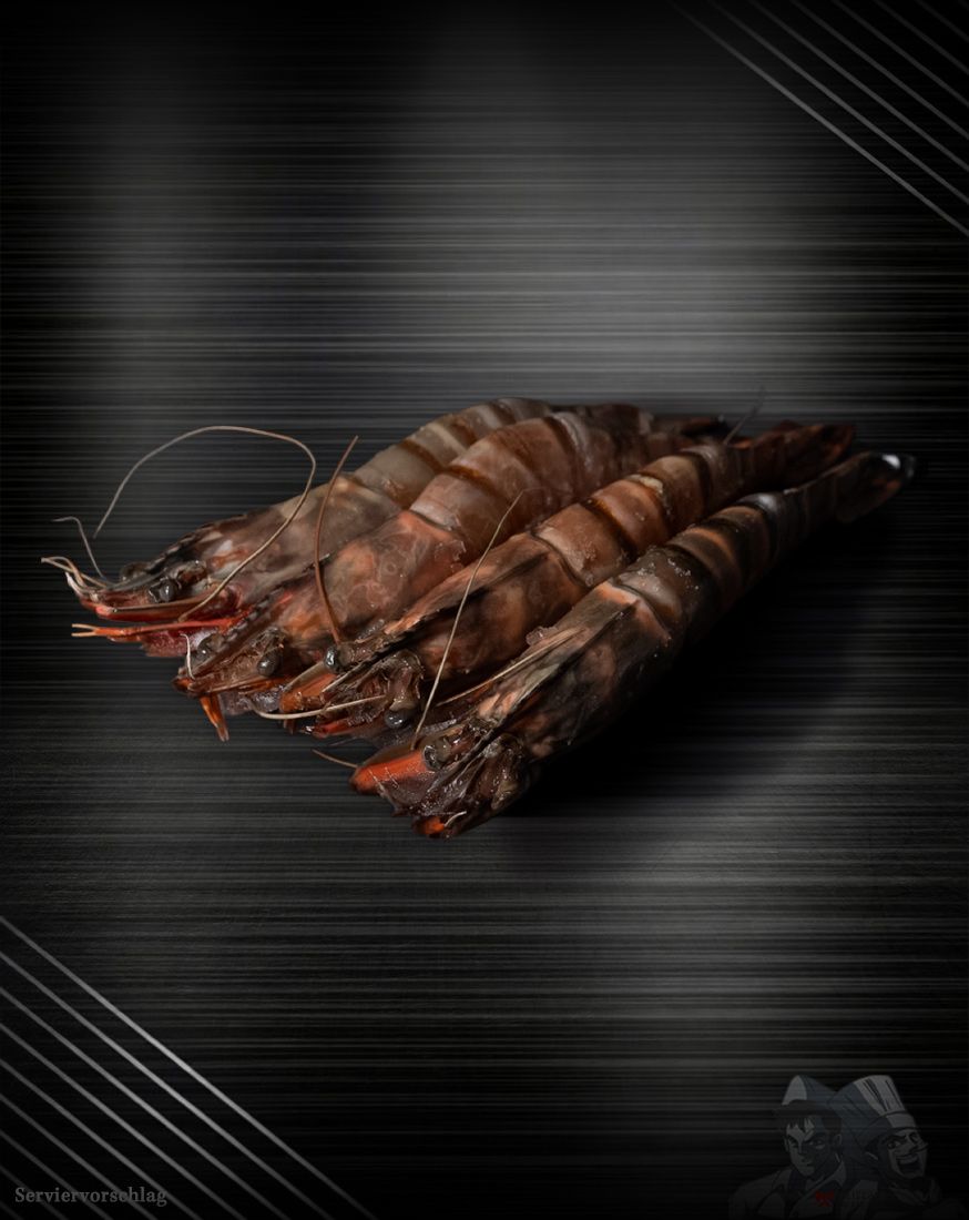 Die Sea Tiger Riesen Garnelen (Penaeus monodon), auch bekannt als Black Tiger Garnelen, sind für ihre beeindruckende Größe und ihren delikaten Geschmack beliebt. In der Größe 4/6 gehören sie zu den mittelgroßen Varianten dieser exquisiten Krustentiere. Die Garnelen werden in den Küstengebieten Indiens wild gefangen (Fanggebiet FOA-57)