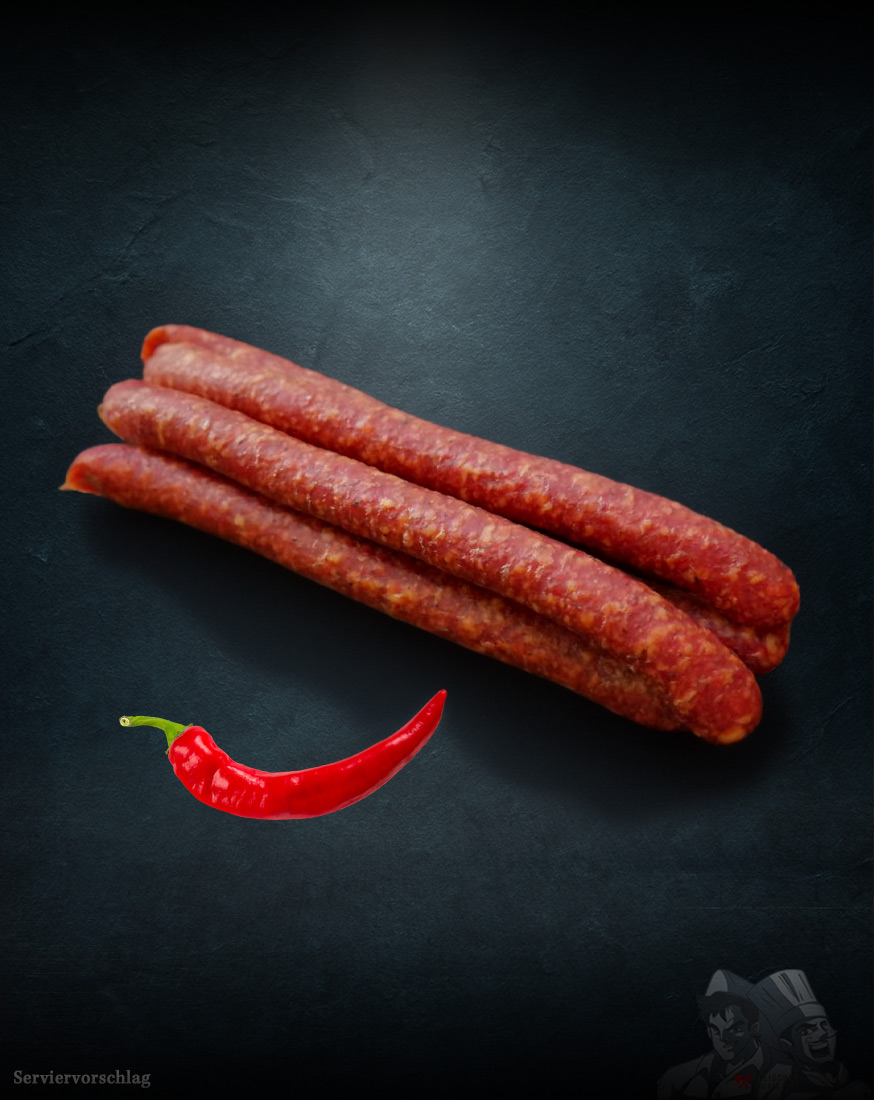 Unsere Chili-Knacker sind bewusst als mittel-pikant eingestuft. Die Schärfe ist deutlich, aber nicht übermächtig – sie begleitet den Geschmack, statt ihn zu überdecken. Verantwortlich dafür ist die Kombination aus edelsüßer und rosenscharfer Paprika sowie groben Chiliflocken. So entsteht eine lebendige Würze, die sich im Nachhall zeigt, ohne zu brennen. Wer regelmäßig scharfe Speisen genießt, empfindet sie als angenehm würzig; für empfindlichere Gaumen sind sie kräftig, aber gut ausbalanciert. Der Rauch rundet das Ganze ab und bringt Tiefe ins Aroma. In Kombination mit Senf, Brot und einem kühlen Getränk zeigt sich die Schärfe von ihrer besten Seite – harmonisch, charaktervoll und nie aufdringlich.