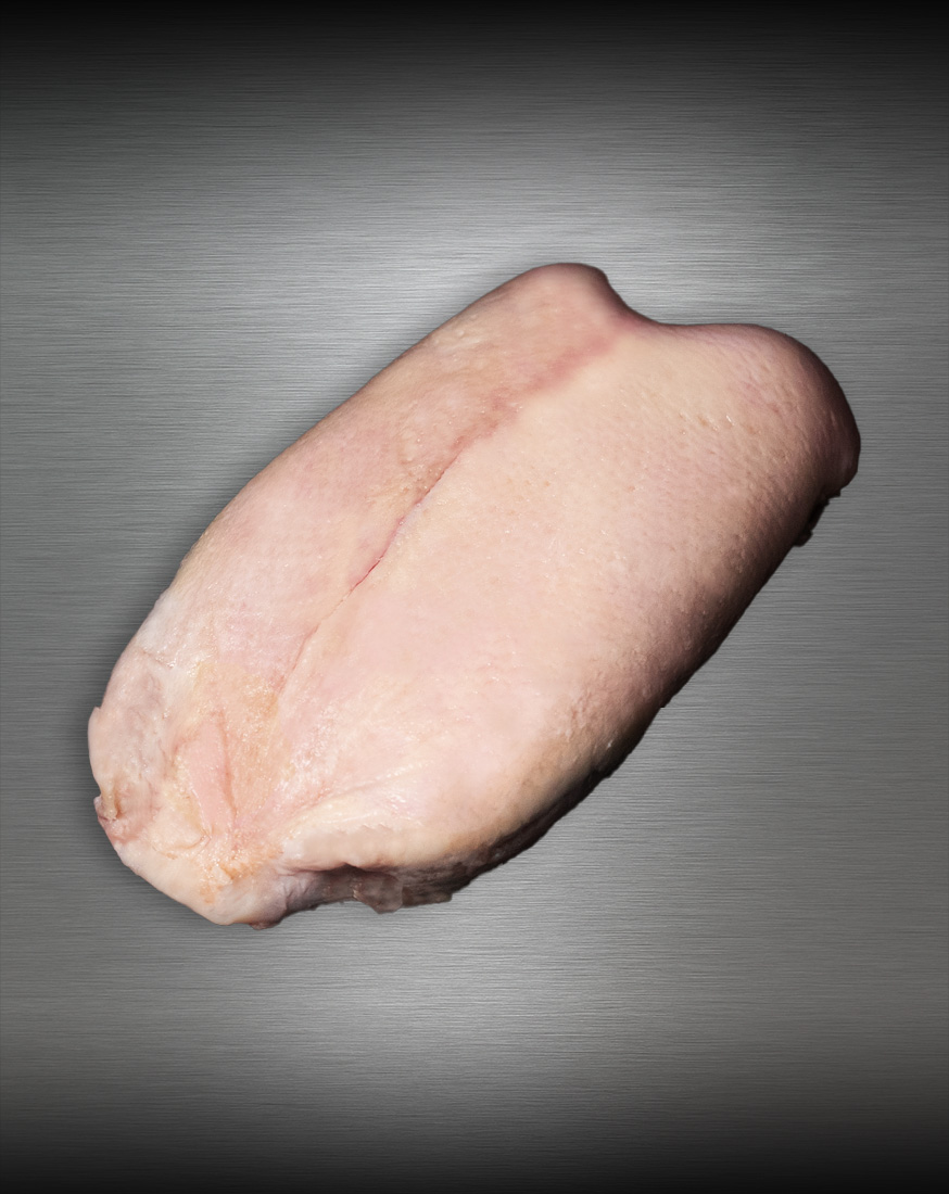 - Zuschnitt: Gänsebrust mit Knochen, Haut intakt, pariert