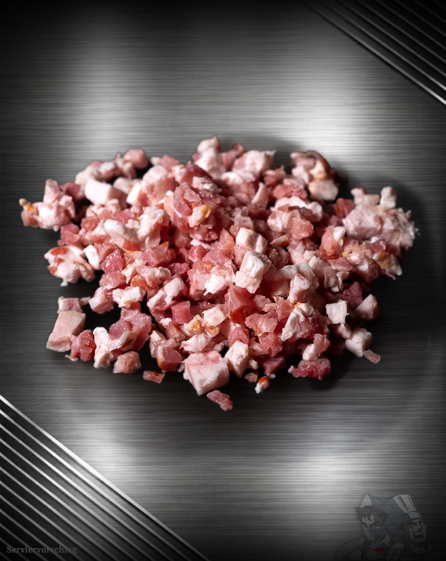 - Würfelschnitt: Gleichmäßig geschnittene Speckwürfel gewährleisten ruhiges Auslassen und einheitliche Bräune ohne Austrocknen.